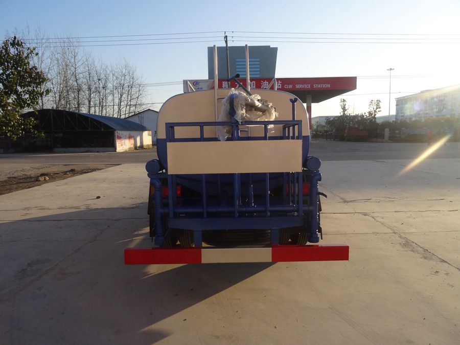 改裝配置:罐體采用4mm厚武鋼專用容積板制作,實際容積5立方,罐內隔板具有防波作用,以減低汽車行駛時罐體液體的沖擊。泵 進泵出,消防栓接口,前沖、后灑、側噴、后工作平臺帶綠化水炮,垂直吸程≧7米,灑水寬度≧14-16米,射程≧20-25米,引水時 間<5min,流量90m3/h。自流閥、濾網、帶自吸自排功能。兩根等長輸水管,金屬漆,其余標配?杉友b藥盤、氣動控制閥、噴藥設備、非車帶泵動力等。