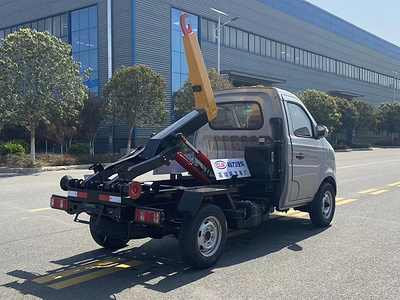 長安底盤改勾臂式垃圾車容積為2~3方,標配邊三底四的垃圾箱一個,采用江蘇液壓油缸液壓泵,國產多路閥。