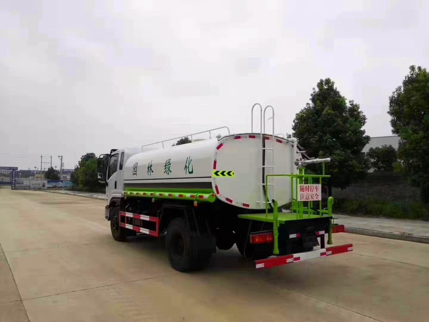 前沖、后灑、側噴、后工作平臺、360度可調節綠化水炮,水泵垂直吸程≧7米,前沖灑水寬度≧14米,綠化水炮射程≧35米,自流閥、濾網、消防接口(可連接消防栓取水,可作應急消防用)。罐前量管(觀察罐內水位)、罐后爬梯、罐上罐口帶簡易護欄、罐側雙炮筒、6米長4寸鋼絲塑膠管兩根,罐體表面雙層油漆工藝,防銹、耐腐蝕,其余有廠家標配。可選擇加裝加裝藥盤、氣動控制閥、噴藥設備、罐內防腐等。也可加裝液位計?膳渲萌β氏儡嚍⑺囁,應急時可作消防灑水車之用。我廠生產的灑水車均為多功能綠化噴灑車,可滿足不同用戶在不同的使用環境中使用,灑水泵可起到吸水和加壓排水功能,也可不通過泵自排水。