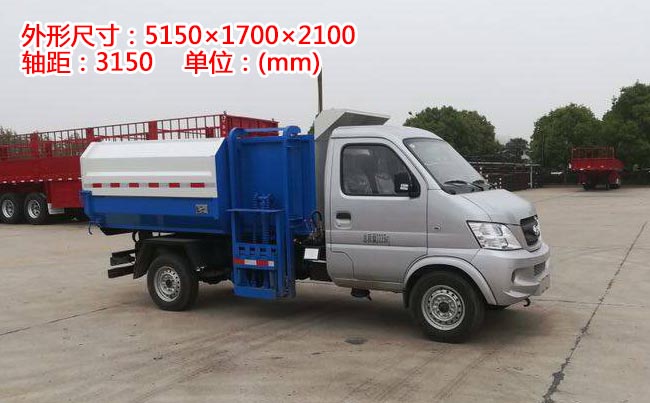 東風小康掛桶式垃圾車,東風小康駕駛室,2760(mm)軸距,渝安淮海69馬力,5檔變速箱,輪胎型號165/70R14。