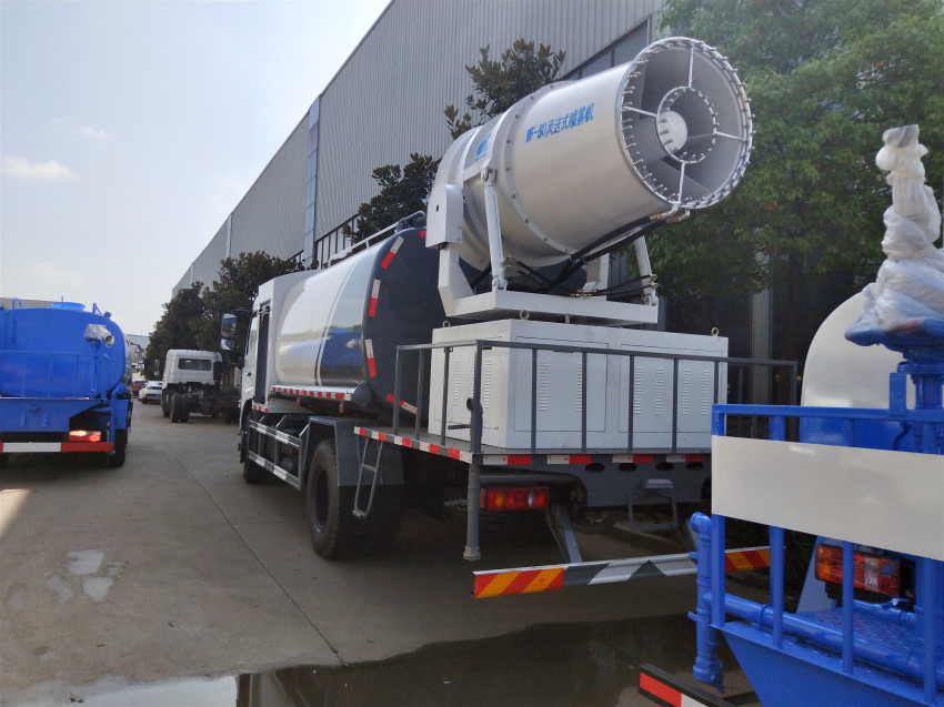 霧炮車是防污降塵的一種先進設備,可將灌裝水以高壓驅動形成強大噴霧,噴灑至空中,風炮射程達到100米,噴霧流量可達80L/min,噴灑范圍廣,凈化空氣能力強,具有強大的噴灑功效,且具有前沖、后灑,左右噴灑等多種功能抑塵和清潔空氣的車輛