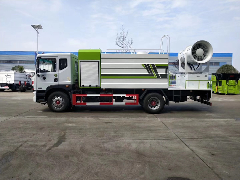 霧炮車罐體采用5mm厚碳鋼板制作,罐體容積12噸,配備大功率專用灑水泵。前沖(噴)后灑,帶側(cè)噴,后置工作平臺(tái),平臺(tái)上安裝綠化灑水高壓炮(炮噴射形狀可調(diào)成直沖狀、大雨、中雨、毛毛雨、炮可360度旋轉(zhuǎn),射程≧25米)。帶自流閥,消防接口。帶自吸泵,可抽水或從消防栓上連接注水。后工作平臺(tái)可加裝最小50米霧炮或60米、80米霧炮。