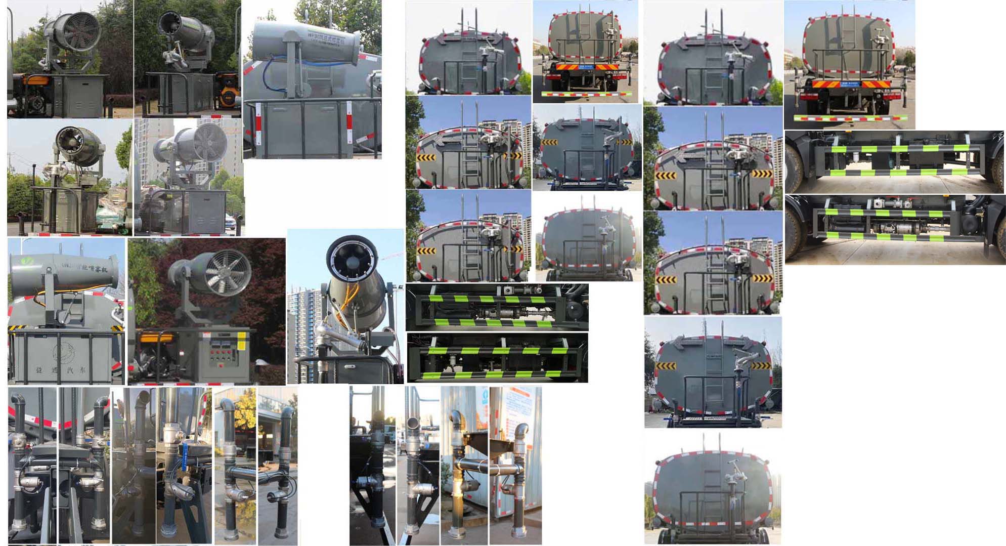我公司產品標配前噴(鴨嘴)、后沖、后灑、側噴、后置式工作 平臺,平臺上配置綠化水炮(可 360°旋轉,既可以調成柱狀,也可 以調成霧狀,更可以調成直沖狀、大雨、中雨、小雨、毛毛雨),配 備優質大功率專用灑水泵(可自吸自排,可從河里或池塘抽水到罐體), 取力器,雜物過濾網,消防接口,自流球閥系統、取力器、球閥、濾網 均為國家標準產品,主管道加粗,法蘭墊、法蘭盤加厚,大通徑球閥。 整體具備性能優良安全可靠、效率高、流量大、維修方便等特點。