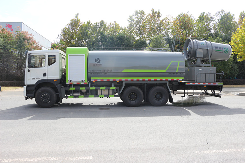 上裝配置:罐體容積15立方米,采用國標5mm優質碳鋼板材制作(可選不銹鋼材質)自吸式灑水泵罐體內設波浪板,大功率車載水泵,具備自吸自排功能;氣動噴灑控制;配前沖、后灑、側噴、消防接口、自流閥、高位花灑、水炮及后工作平臺,水炮可全方位旋轉,最大射程30米,可連續調成直沖狀、大雨、小雨及霧狀;垂直吸程≧7米,灑水寬度≧14-16米,其他廠家標配。