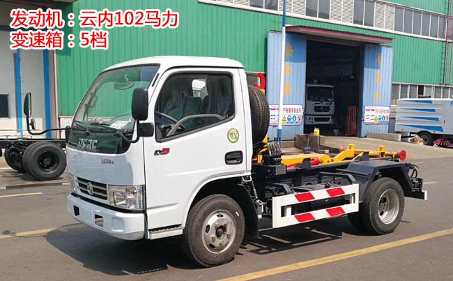 風小多利卡D5勾臂式垃圾車,東風小多利卡D5駕駛室,云內102馬力發動機,5檔變速箱,軸距2.6米,輪胎型號6.50-16輪胎,帶ABS,方向助力。