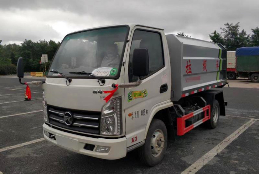 箱體容積3~4立方米,碳鋼邊三底四,國(guó)產(chǎn)油泵、多路閥、取力器、油缸,卸料方式為底部雙杠液壓舉升自卸,駕駛室外操作,鐵桶掛架,后門機(jī)械鎖緊,手動(dòng)開門,可選液壓開門。