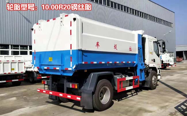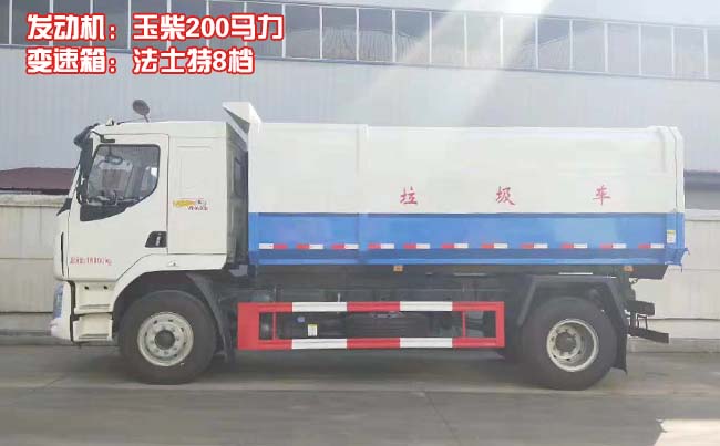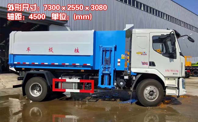改裝容積14立方米,密封式垃圾箱,后蓋手動開啟,掛桶提升機構采用鏈條、液壓油缸聯動裝置,實現將垃圾箱提升翻轉,可將多個垃圾桶收入車廂內,箱體底部采用雙液壓油缸舉升自卸,將垃圾自卸倒出。