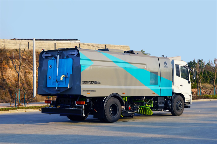 • 部分車型采用中置四掃刷、吸口后置的布置方式,使得整車結(jié)構(gòu)布置簡捷,清掃效果良好。例如程力掃路車就采用這種布局方式,其垃圾箱及水箱全部采用超厚不銹鋼材料制作,垃圾箱與水箱為整體結(jié)構(gòu),水箱在垃圾箱的底層使垃圾箱底板預(yù)傾角高達(dá)12°以上,便于垃圾傾倒干凈。