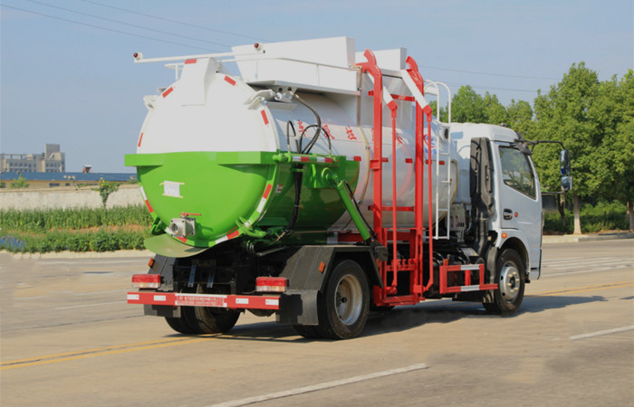 ★上裝配置:罐體采用 4mm 優質碳鋼制作,圓形罐體,罐體前后封頭采用圓弧蝶形封頭,配拉桿式提升機,罐體底部配雙缸液壓舉升自卸,罐體尾門液壓打開和鎖緊+手動鎖緊裝置,罐內設固液分離裝置,罐尾設液體自流閥,液位窗,后門液壓開啟,帶工具箱,洗手裝置。
