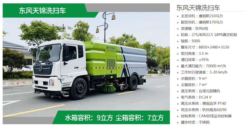東風18噸洗掃車,帶2個中置掃盤,天錦為康明斯170馬力副發動機;三洋馬達;高壓水泵(前沖/側噴/中噴/后噴霧/沖洗水槍/垃圾箱自潔裝置);高壓路沿清洗噴頭,低壓泵(前沖);不銹鋼垃圾箱;控制器;控制箱;PLC一鍵控制;尾部LED箭頭燈;垃圾箱、水箱均帶防溢低水位報警裝置;倒車及洗掃狀態室內監視器。20m高壓沖洗卷盤。