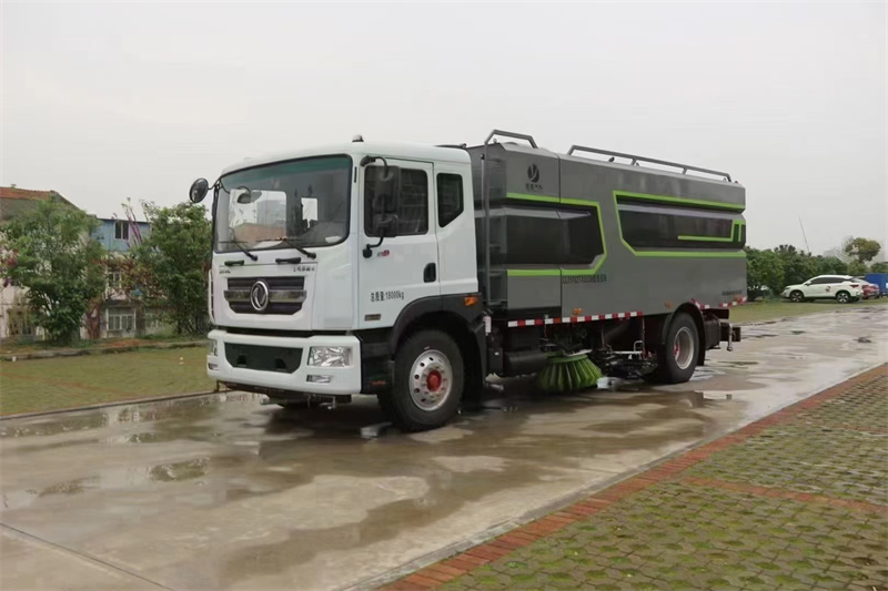 東風D9洗掃車產品特點 1.集掃路車和高壓清洗車功能與一體,實現在一次作業中完成清掃、高壓清洗 和垃圾、污水的 收集。所有功能(全洗掃、全清洗、全掃、左洗掃、右洗掃、 左掃、右掃、左洗、右洗等)可 單獨控制,也可聯動控制。