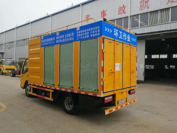 底盤型號:EQ1041SJ3BDF,發動機玉柴YC4FA115-50,7.00R16鋼絲胎,帶動轉,氣剎,方向助力,整車顏色工程黃。 上裝配置:18.5千瓦電機1臺,配電柜1臺,4寸排污泵一臺,5.5KW水循環真空泵1臺,3方高壓水箱,1.5立方液壓絞龍式/滾筒式污水分離箱,帶高壓清洗功能,采用意大利普蘭索特16MPA高壓泵,箱體材質采用熱板制作,后部帶LED屏,配工具箱一個。100mm吸污管4根(每根6米),60米Ф19mm的高壓管,帶10個噴頭。