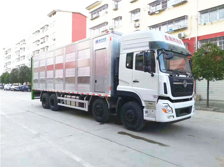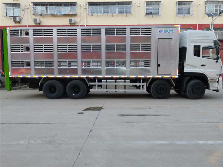 東風(fēng)天龍9.6米鋁合金拉豬車后門整體升降,裝豬時候從下往上裝第1層,依次第2層,第3層,下豬時候從上往下,鋁合金拉豬車比之前不銹鋼拉豬車自重更輕,箱體兩邊可以左右軒開,人可以站直在箱體內(nèi)清洗更方便